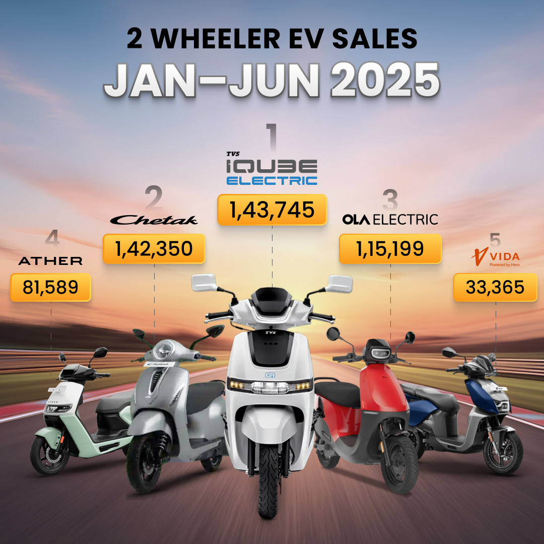 India’s Two-Wheeler EV Race: TVS iQube Leads H1 2025 India’s two-wheeler EV market continues its steady growth, with TVS iQube topping the sales chart for January–June 2025. The iconic Chetak and Ola Electric follow close behind, reflecting the fier