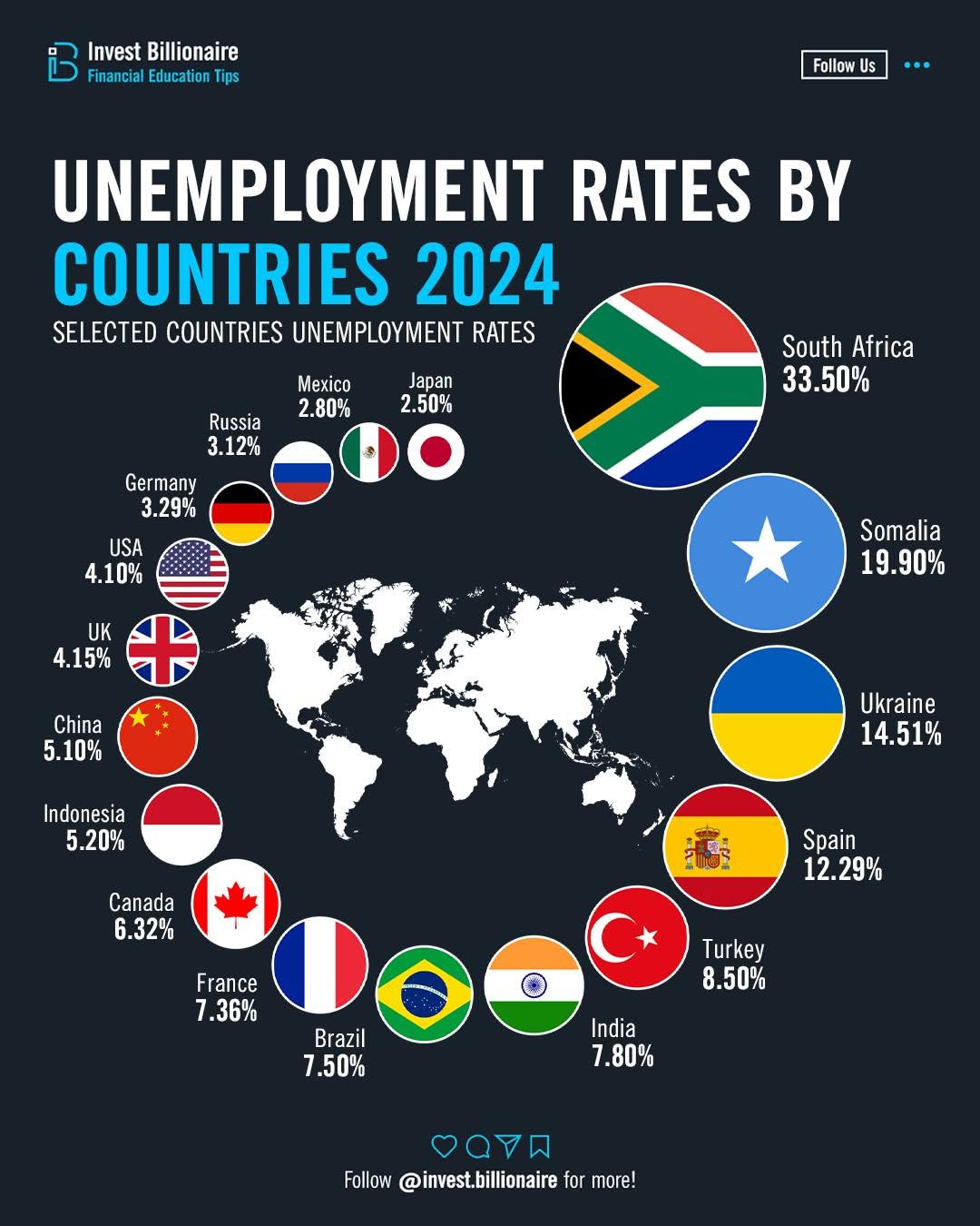 ๐ Unemployment Rates by Country 2024 ๐ Key Insights: 1๏ธโฃ Lowest Unemployment: Japan (2.5%) and Mexico (2.8%). 2๏ธโฃ Global Giants: USA (4.1%), China (5.1%), India (7.8%). 3๏ธโฃ Europe: Germany (3.29%), UK (4.15%), France (7.36%), Spain (12.29%). 4