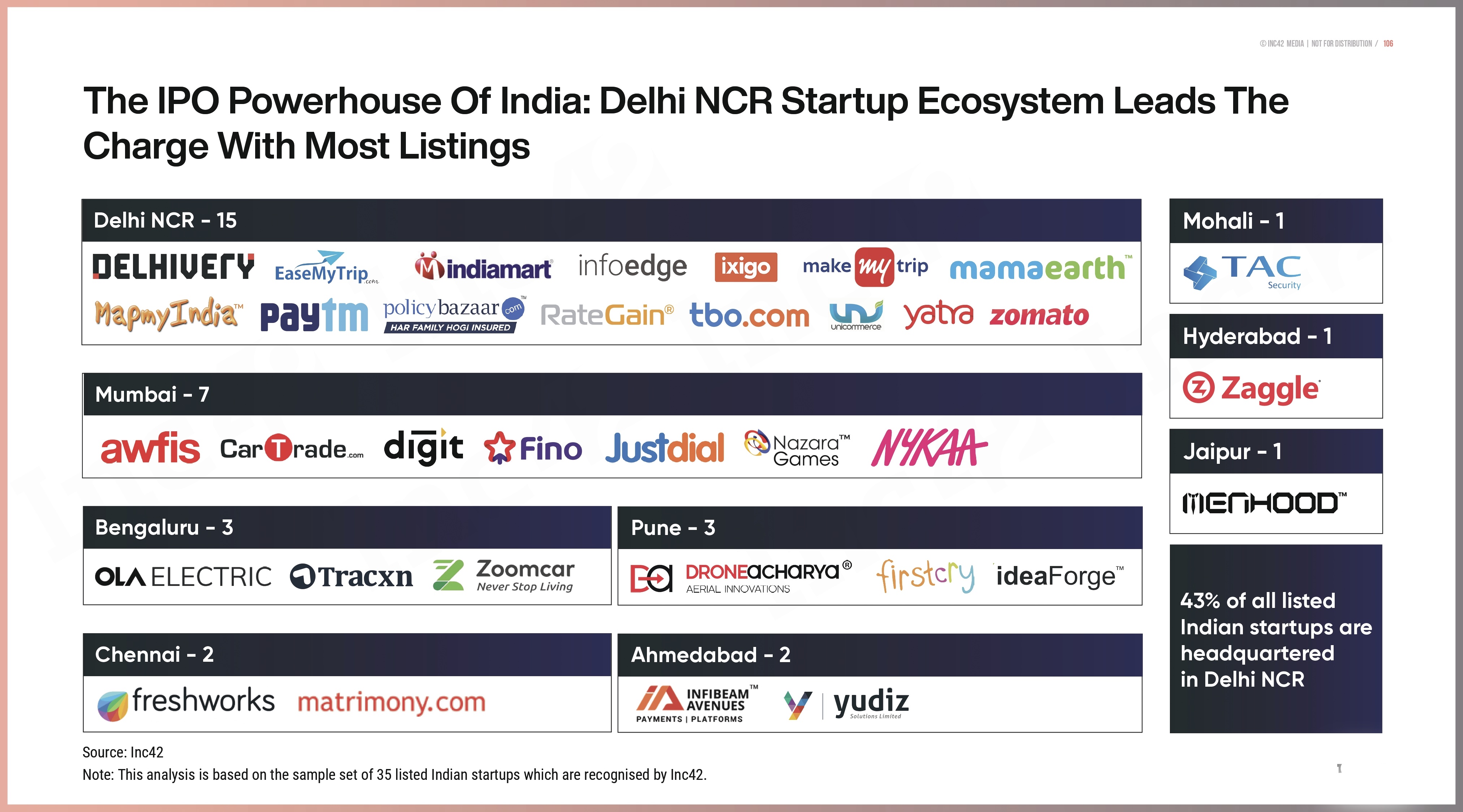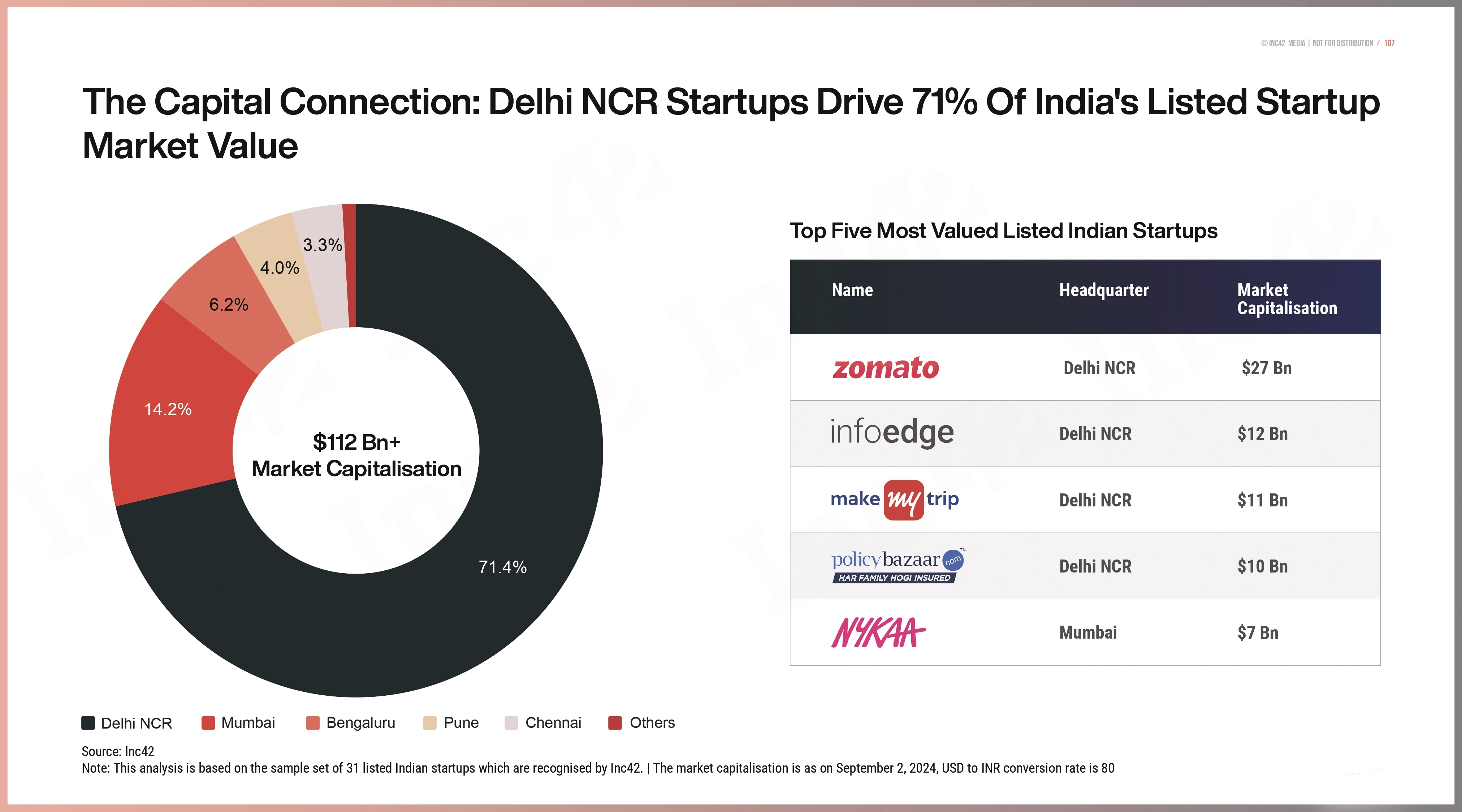 Delhi NCR Startups Lead India's Startup Market: With 71% of the market value, Delhi NCR dominates India's listed startup ecosystem, home to top names like Zomato, InfoEdge, and MakeMyTrip. Out of the 35 listed startups, 15 are headquartered in the re
