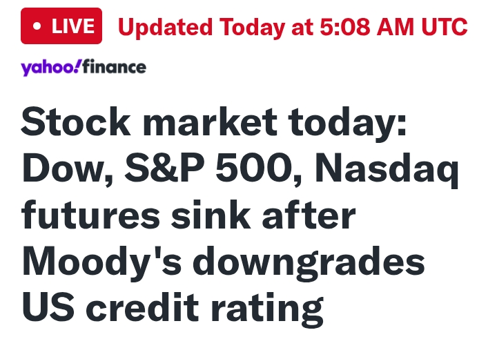Moody’s just downgraded the U.S. credit rating from AAA to AA1 huge blow to confidence. Last week, Nasdaq surged 7%, S&P 500 5%, Dow 3% on tariff truce. But today? Futures drop: Dow -0.9%, S&P -1.2%, Nasdaq -1.6%. Debt fears now shaking markets hard.