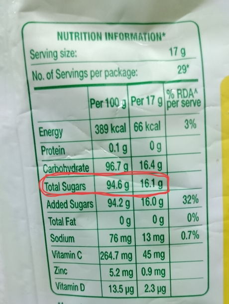 Tang Mango contains 94 grams of sugar per 100 grams, which is harmful to health due to risks like obesity and diabetes. Limiting intake is recommended for better health outcomes.