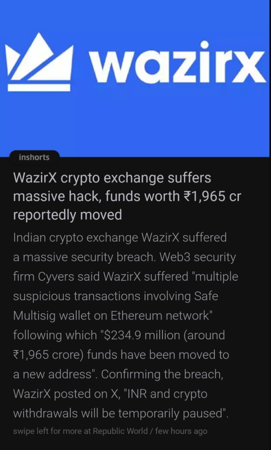 Indian crypto exchange WazirX suffered a massive security breach. Web3 security firm Cyvers said WazirX suffered "multiple suspicious transactions involving Safe Multisig wallet on Ethereum network" following which "$234.9 million (around ₹1,965 cror