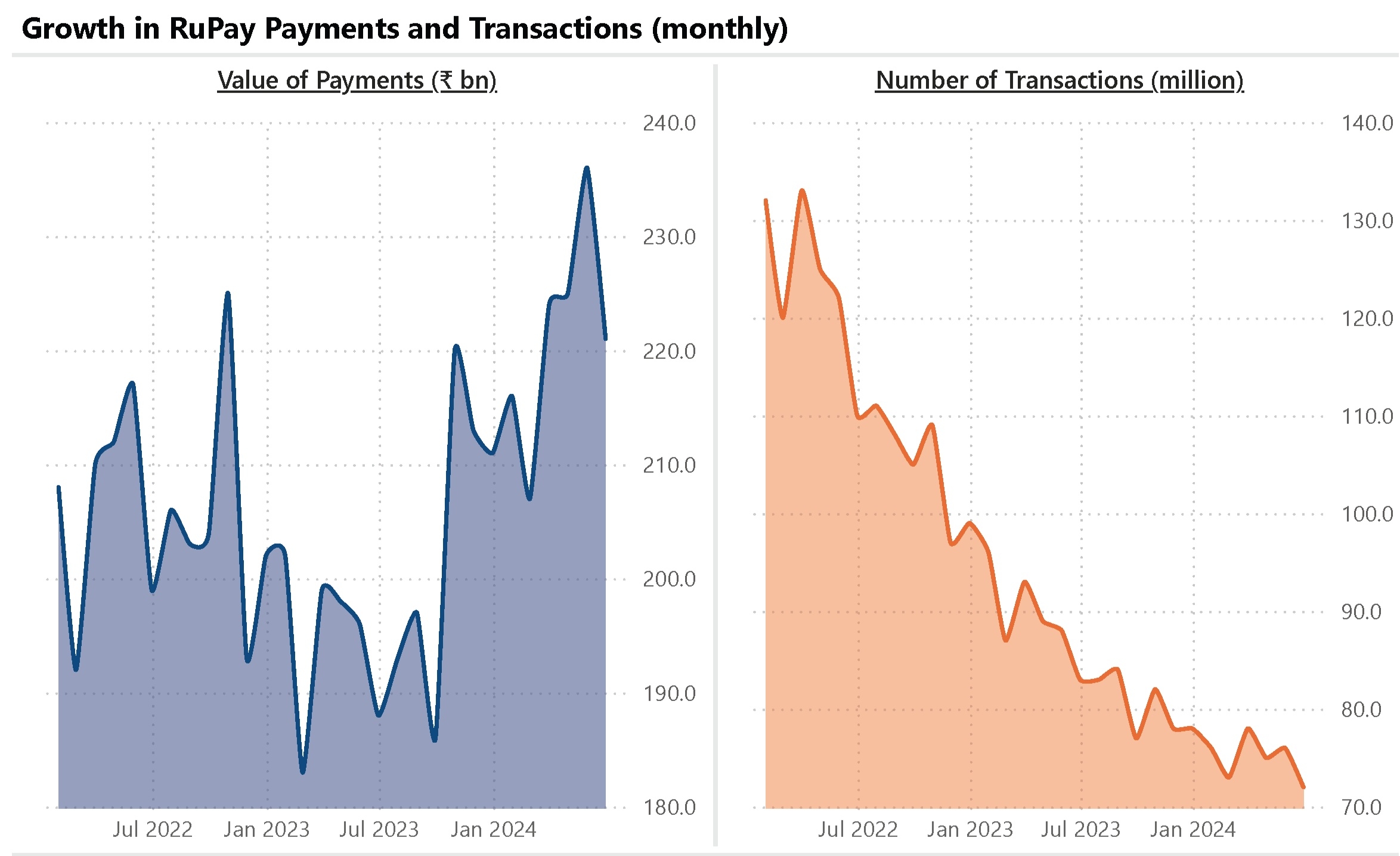 ONE INTERESTING OBSERVATION SERIES DAY #17 Let me tell you something interesting about Rupay, our domestic payment network that's competing with Visa and MasterCard. The volume of transactions processed through it has been declining for 24 months straight. From June 2022 to June 2024, the number of transactions fell by over a third. Sounds concerning, but nothing surprising right? Here's the other side of the picture. The value of transactions processed is rising! June saw a 17% growth, the 5th consecutive month of double-digit growth. Volume down, value up! What could be the reason behind this? Lemmino!!