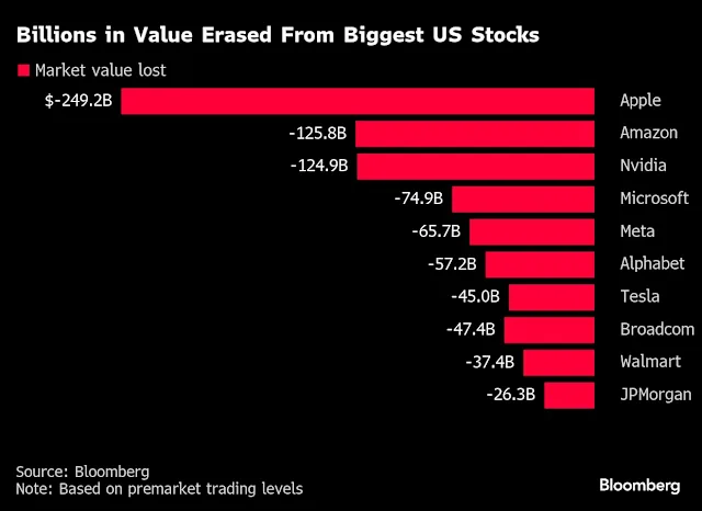 Investors definitely not liking Trump's tariff policy .After Trump's tariff announces in all countries in just a few HOURS of trading, the US stock market saw ~$2 TRILLION vanish into thin air! ๐ณ๐ฅ Apple ๐: -$249.2B๐ป๐คฏ Amazon ๐ฆ: -$125.8B๐ป๐คฏ Nvi