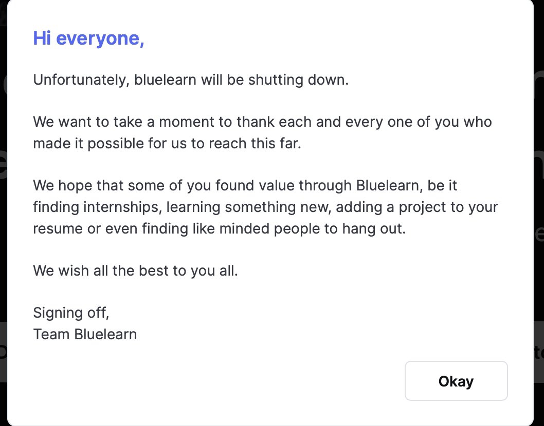 Bluelearn is shutdown - A very good decision Not criticizing them ,but actually this is a very great move if you don't foresee any revenue model Really appreciate the appetite of the founders 🙌