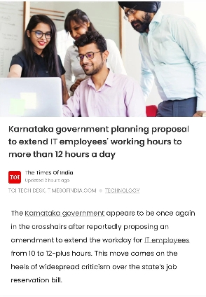 Karnataka is considering implementing a new bill that would require tech workers to work 14 hours a day, 70 hours a week. Share ur thoughts 🤔