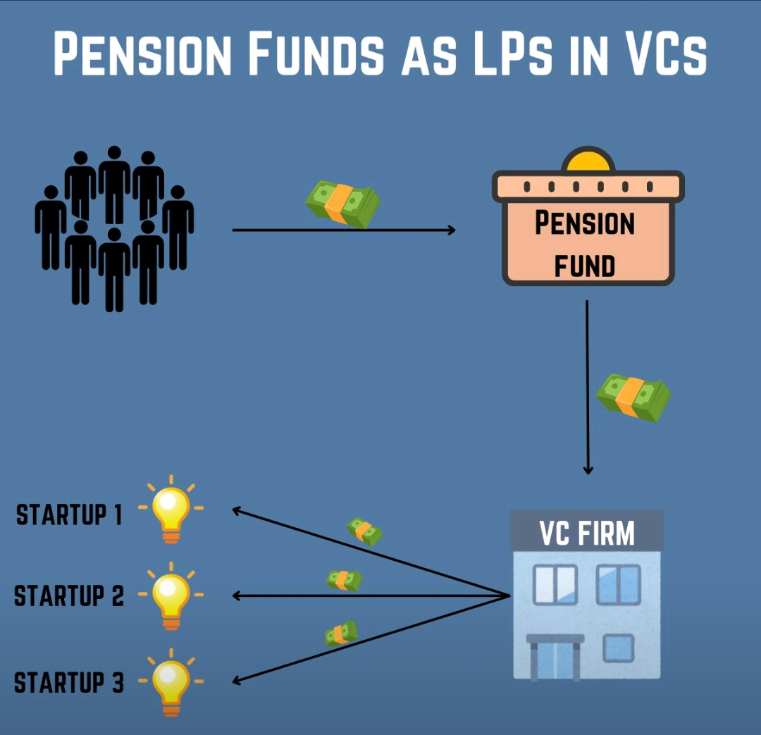 This is how the VC ecosystem works. - People from Canada and the USA contribute their money every month to a pension fund with the aim of receiving a pension once they retire - The pension fund, aiming to generate returns, allocates its money to v