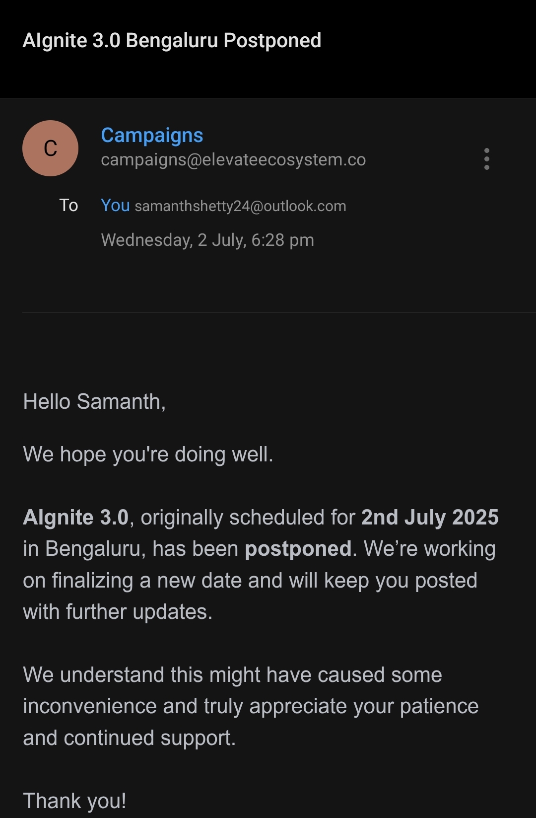 Who the ''""" will say that event is postponed the day it had to be held ? I was so disappointed by them not sending the venue and etc. But then after the event starts, after an hour i get a mail saying it's postponed ? Broo what's happening it's i