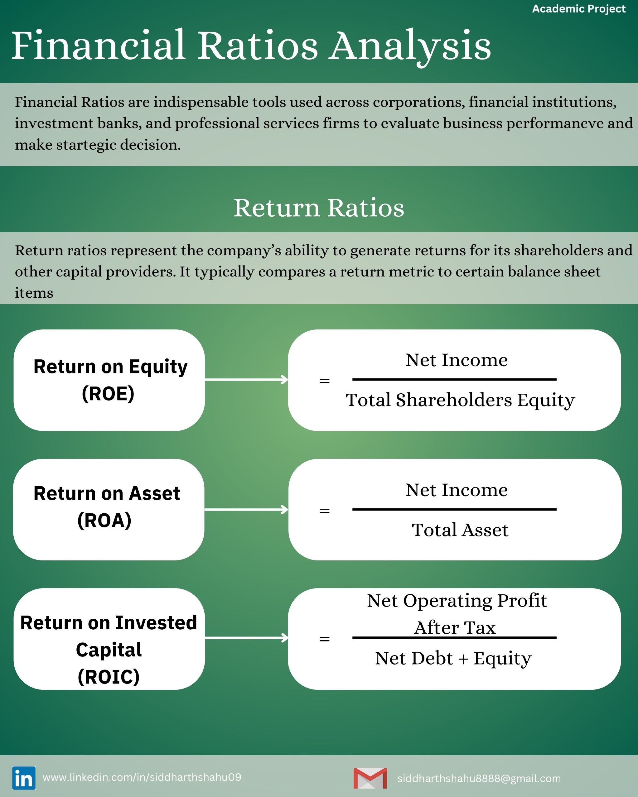 Hello Community, As part of my academic journey, I recently completed an in-depth analysis of financial ratios. These ratios provide valuable insights into a company’s performance, liquidity, and profitability. Let me share some insights of my project: 1. Return Ratio 2. Profitability Ratio 3. Expense Ratio 4. Asset Utilization Ratio 5. Liquidity Ratio 6. Solvency Ratio Remember, these ratios are powerful tools for decision-making, whether you’re an investor, analyst, or aspiring finance professional. 🚀 Feel free to connect with me if you’d like to dive deeper into this topic! #Finance #FinancialAnalysis #InvestmentInsights #Innovation #AcademicProject #Growth