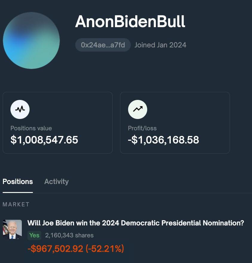 Darwin Award Nominee - Someone bet $2 million that Joe Biden would be chosen as the Democratic Party's presidential candidate in June, when it seemed inevitable. ๐ค๐ธ After unsuccessful debates and rumors about replacing Biden, the person stopped co
