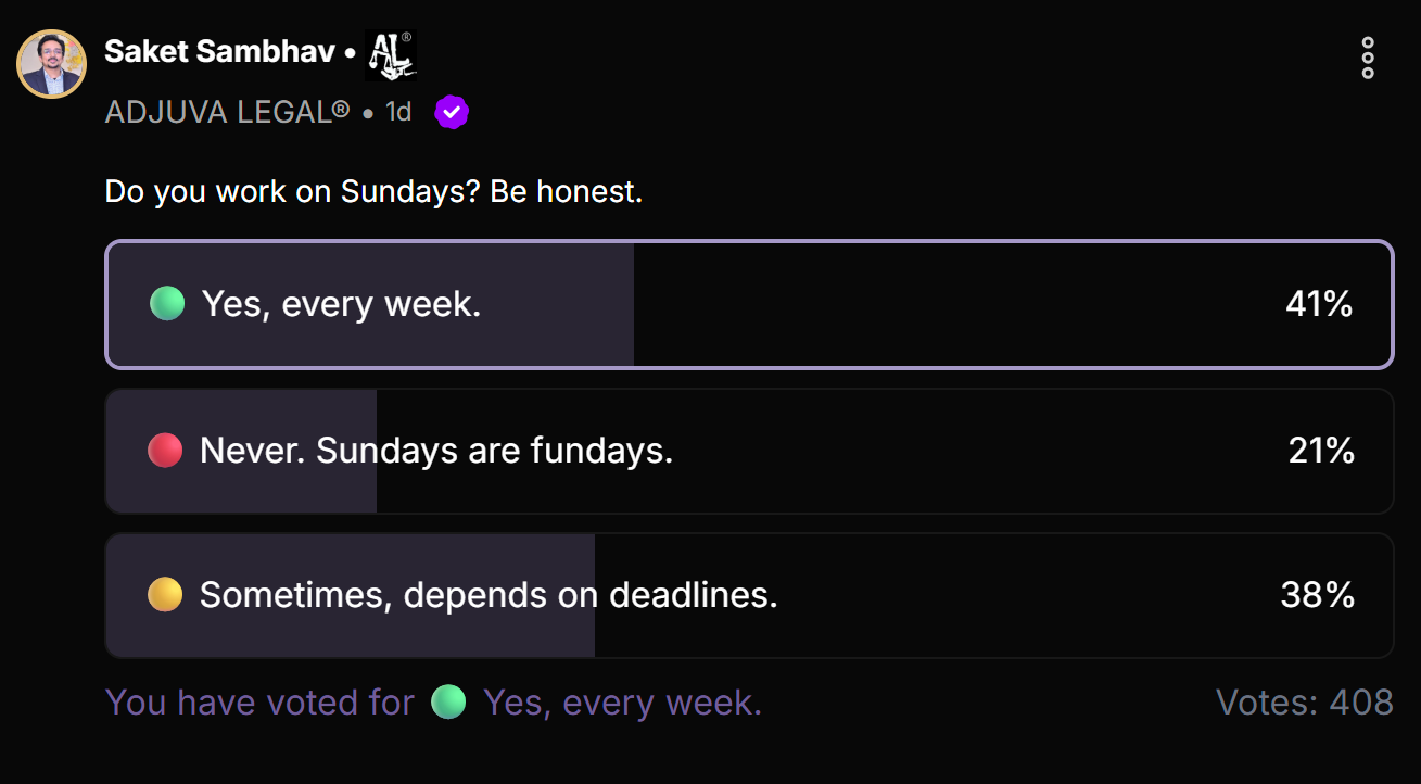 ๐ฌ The Sunday Work Dilemma 408 votes. 41% work every Sunday. 38% sometimes, if deadlines demand it. 21% keep Sundays sacred. I voted Yes, every week. But hereโs the truth - itโs not about hustle worship. For founders, activists, and changemake