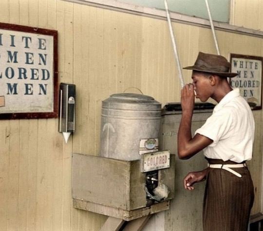 A black guy drinks water from a fountain reserved for whites only, Oklahoma City, USA, July 1939