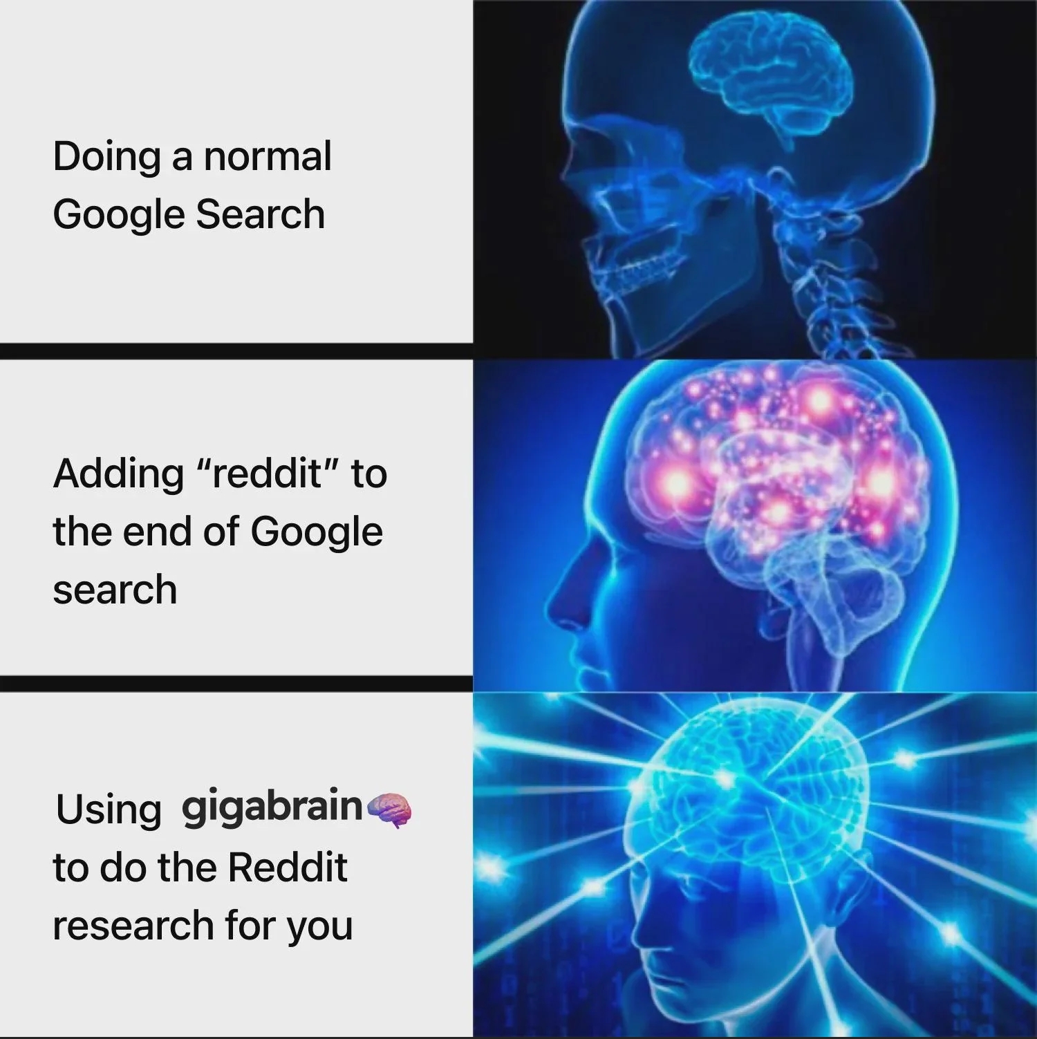 Stop adding "Reddit" to your Google searches! Instead, try GigaBrain, an AI-powered search engine that scans billions of Reddit discussions for real comments and answers. It combines human feedback wth AI tools to give you reliable insights from knowledgeable users. GigaBrain's mission is to bring valuable offline human knowledge online effectively. Google and ChatGPT often struggle with certain questions. Google can return endless lists of low-quality blogs feel untrustworthy, while ChatGPT excels at facts but may not handle questions needing personal experience. GigaBrain is easy and doesn’t require signing up. The user-friendly interface lets you search for anything or browse topics. You can refine results by relevance, recency, or upvotes and see which subreddits are most helpful. Plus, there’s a Chrome extension that finds the best Reddit comments related to your search and analyzes product discussions. Have you ever found Google’s search results frustrating or untrustworthy?