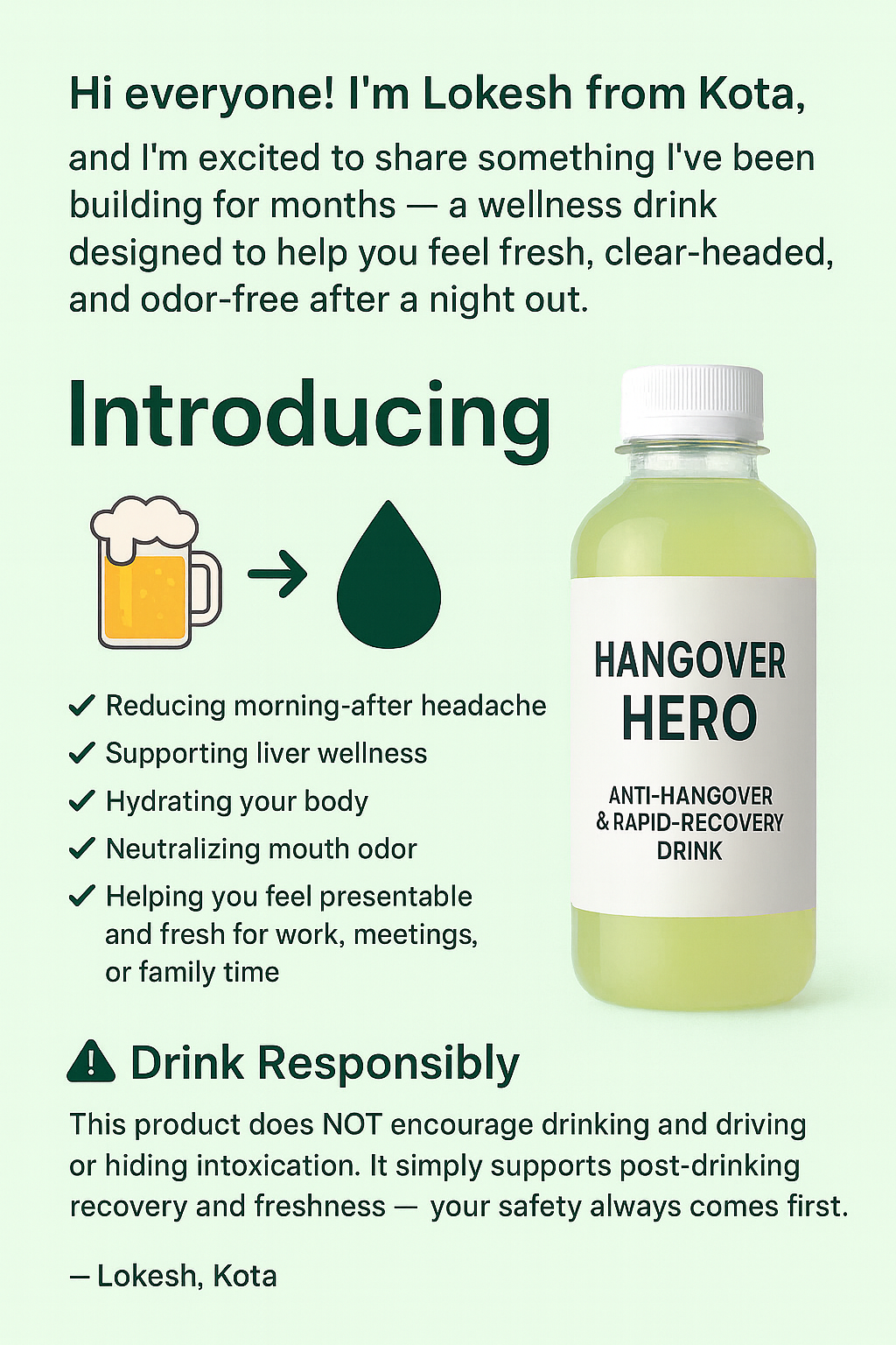 Hi everyone, Lokesh here from Kota š Iām working on an idea that I truly believe can help a lot of people ā an anti-hangover & rapid-recovery drink called āHangover Hero.ā Itās designed to help reduce morning headaches, support liver wellness, hydr
