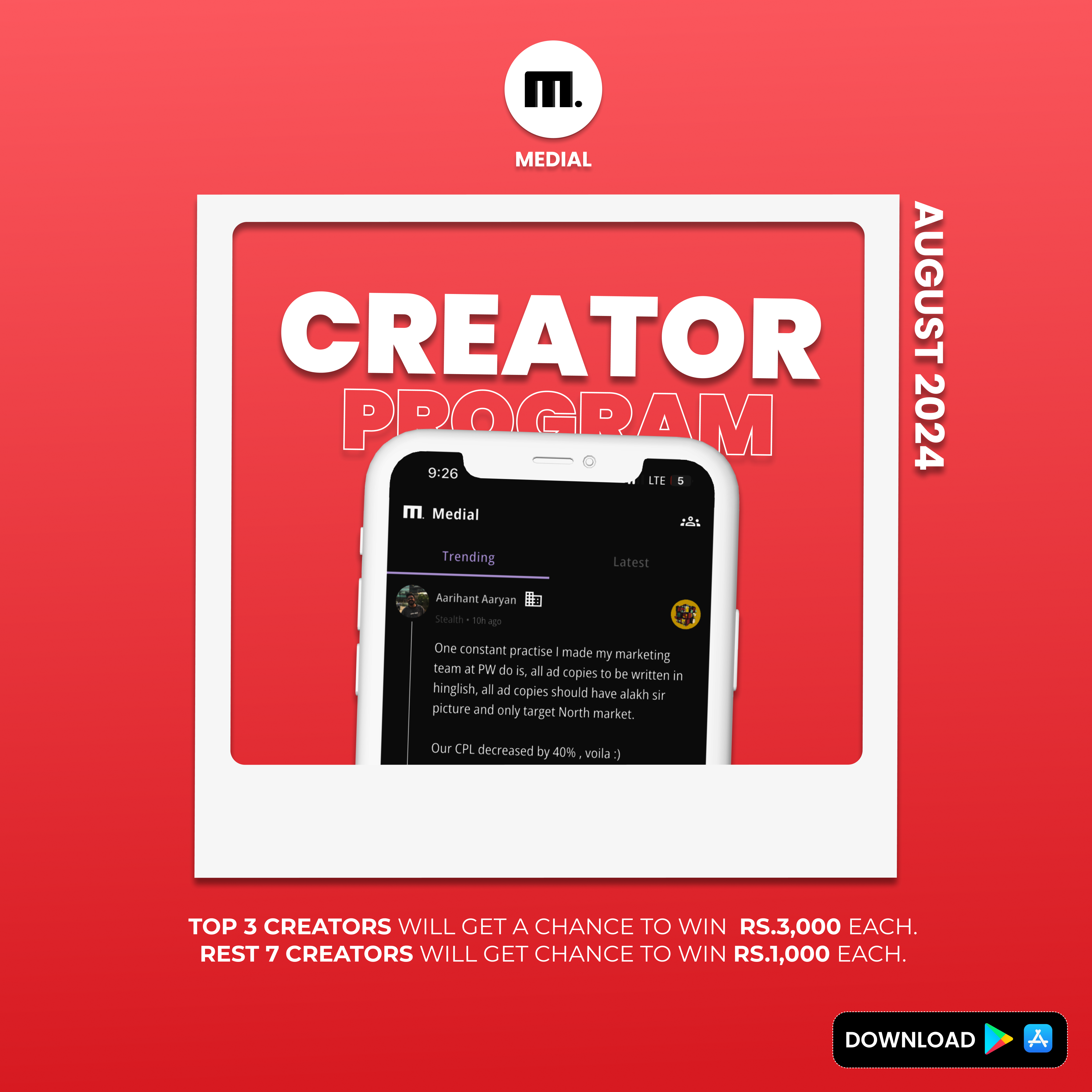 Annoncement! Medial's Creator Program is back! Hello everyone! We’re here to announce Medial’s Creator Program for August. We had the program on pause because we were doing a major launch and faced technical difficulties in assessing results for the last one. But anyway, August will have a total of 10 winners. Top content creators will be decided on the basis of content they create and the comments they make to engage and help the community. Thank you so much for making Medial what it is today. This revolution against clutter and subtraction on the internet is being fought by all of you and our users alongside our team. June month’s creator programs winners will be rewarded with- top 3 with Rs. 3k. Next 7 with Rs. 1k. And surprise hampers. This is what the criteria for winning looks like- 1. Creating meaningful posts. These posts can be around news discussion, startup discussions, tech discussions and other informational or helpful information/posts. Forced posts just for engagement farming will attract negative penalty. 2. Creating meaningful replies- this will count the creators’ replies on other people’s post. Whoever is more helpful, honest, informational and behaved wins points. Forced comments on all posts will attract negative penalty. 3. Users who spend the most time on the platform will gain points. More so if the time spent was spent in meaningful activity for the greater good of the platform. Things to take care of - 1. Don’t be disrespectful/rude to anyone. 2. Don’t post random information from chatgpt/google. 3. Your information/post shouldn’t be boring data from the internet. 4. DO NOT use chatgpt or any AI model to create content. 5. Engage with others and build genuine connections. Whoever has the highest number of “meaningful” posts and replies and time spent on the app will win the top 10 spots. Anonymous posting will be counted as we see the count of number of posts/replies from backend. If you forcibly create content to win this program, we’ll reserve the rights to disqualify you. Winners will solely be decided on Medial’s team’s discretion. Please don’t treat this as a competition. It’s a logical program to incentivise people helping the community. This will be run every month. And have better rewards in the future. Let’s set the platform for greater things ❤️🙏🔥