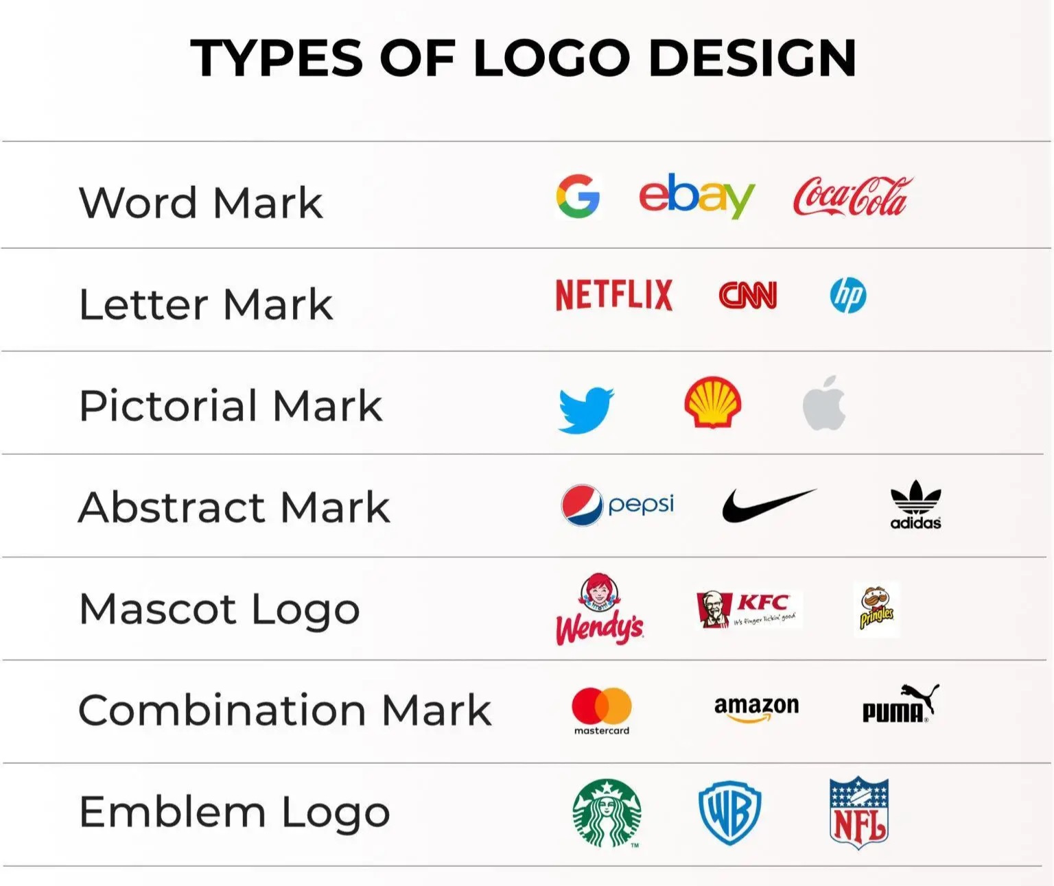 Types of Brand Logos : Monogram (Lettermark): IBM, HBO Wordmark: Google, Coca-Cola Pictorial Mark: Apple, Twitter Abstract Mark: Nike Mascot: KFC Combination Mark: Burger King Emblem: Starbucks Which one suits your brand? 🤔 comment down.