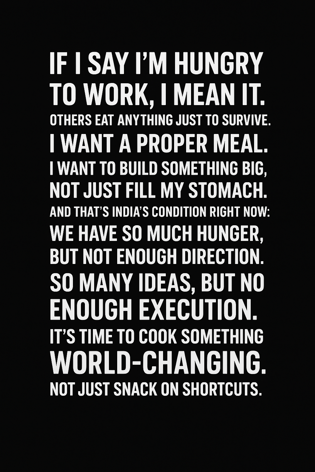 If I say I’m hungry to work, I mean it. Others are hungry too but they eat anything just to survive. I’m different. If I eat, I want a proper meal. I want to build something big, not just fill my stomach. And that’s India’s condition right now: We
