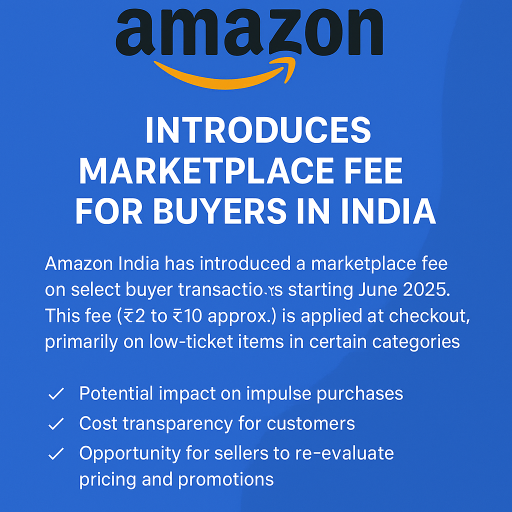 ๐ Amazon Introduces Marketplace Fee for Buyers in India Amazon India has quietly rolled out a marketplace fee on select buyer transactions starting June 2025. This nominal fee (โน2 to โน10 approx.) is added during checkout, primarily on low-ticket it