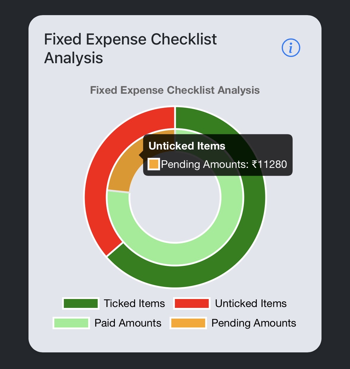 Finding it tough to manage your fixed expenses? Here at Pennywise app, we have simplified the solution with a Donut Chart visual - it showcases the items that have been paid and whatever that is pending for the current month cycle. We are actively