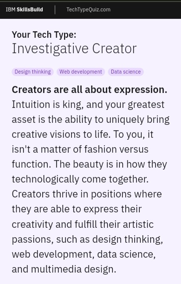 🚀 Embracing My Tech Type: Investigative Creator! 🚀I recently took a tech type quiz from IBM SkillsBuild, and I'm excited to discover that my tech type is an Investigative Creator! 🎨💻As an Investigative Creator, I thrive in blending technology with creativity, turning visions into reality through design thinking, web development, data science, and multimedia design. For me, it's not just about choosing between fashion and function—it's about seamlessly integrating both to create something truly impactful.In a world where technology and creativity increasingly intersect, I’m excited to continue exploring opportunities that allow me to express my artistic passions while driving innovation.Looking forward to connecting with like-minded professionals and exploring how we can collaborate to bring unique ideas to life!#TechType #InvestigativeCreator #DesignThinking #WebDevelopment #DataScience #CreativityInTech #Innovation #IBM #SkillsBuild
