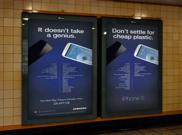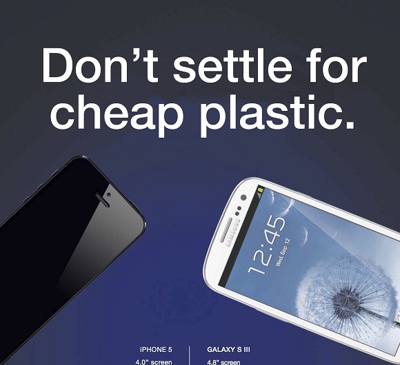 "Donโt Settle for cheaper plastic" Marketing Face off #2 Apple vs Samsung The advertisement came from Samsung that directly compares their Galaxy S3 with iPhone soon after the verdict in the patent case went in favor of Apple. Samsung in the ad