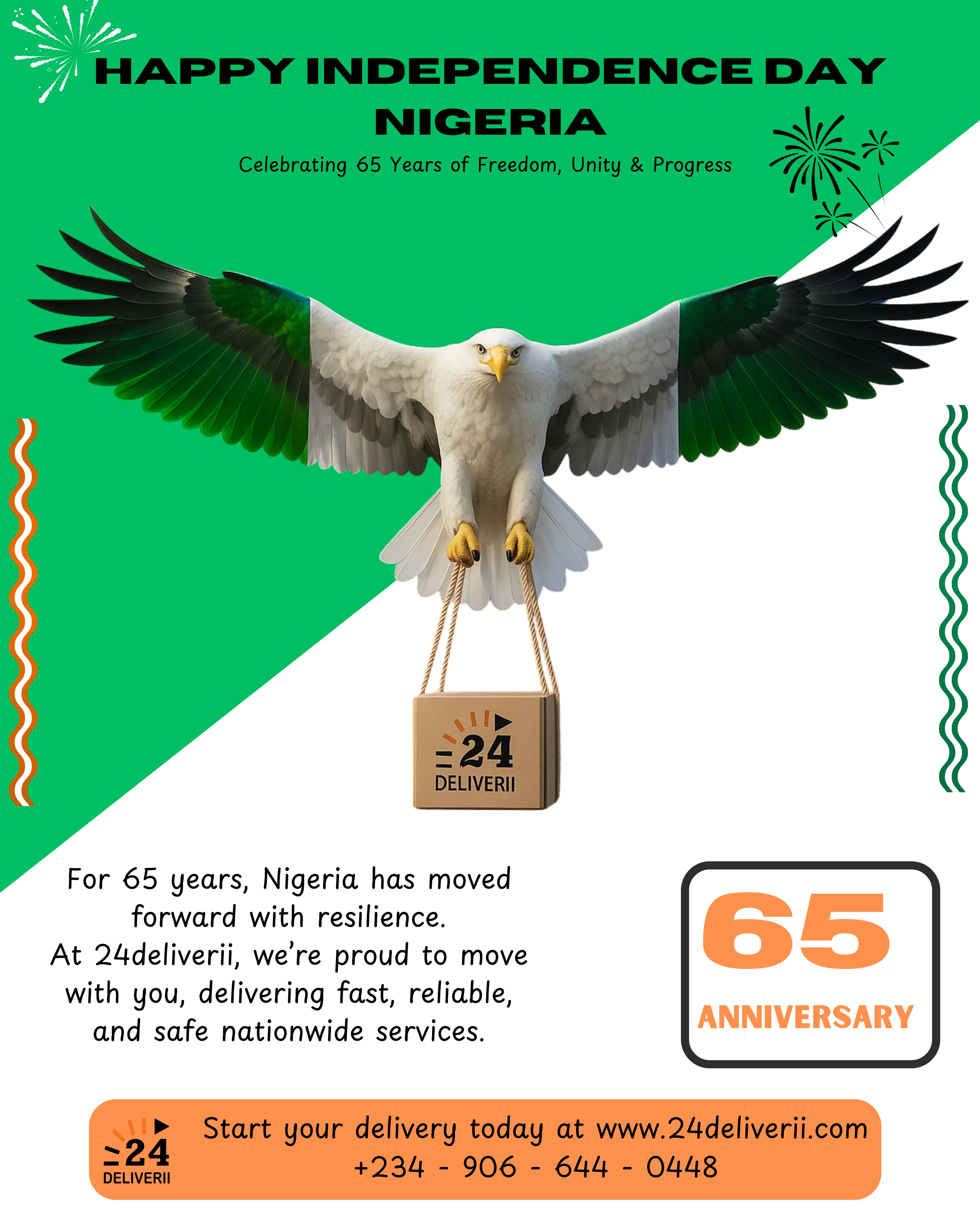 Happy 65th Independence Day, Nigeria. For 65 years, our nation has stood strong with unity, freedom, and resilience. At 24deliverii, we celebrate this journey by keeping Nigeria connected through swift, safe, and reliable delivery across every state.