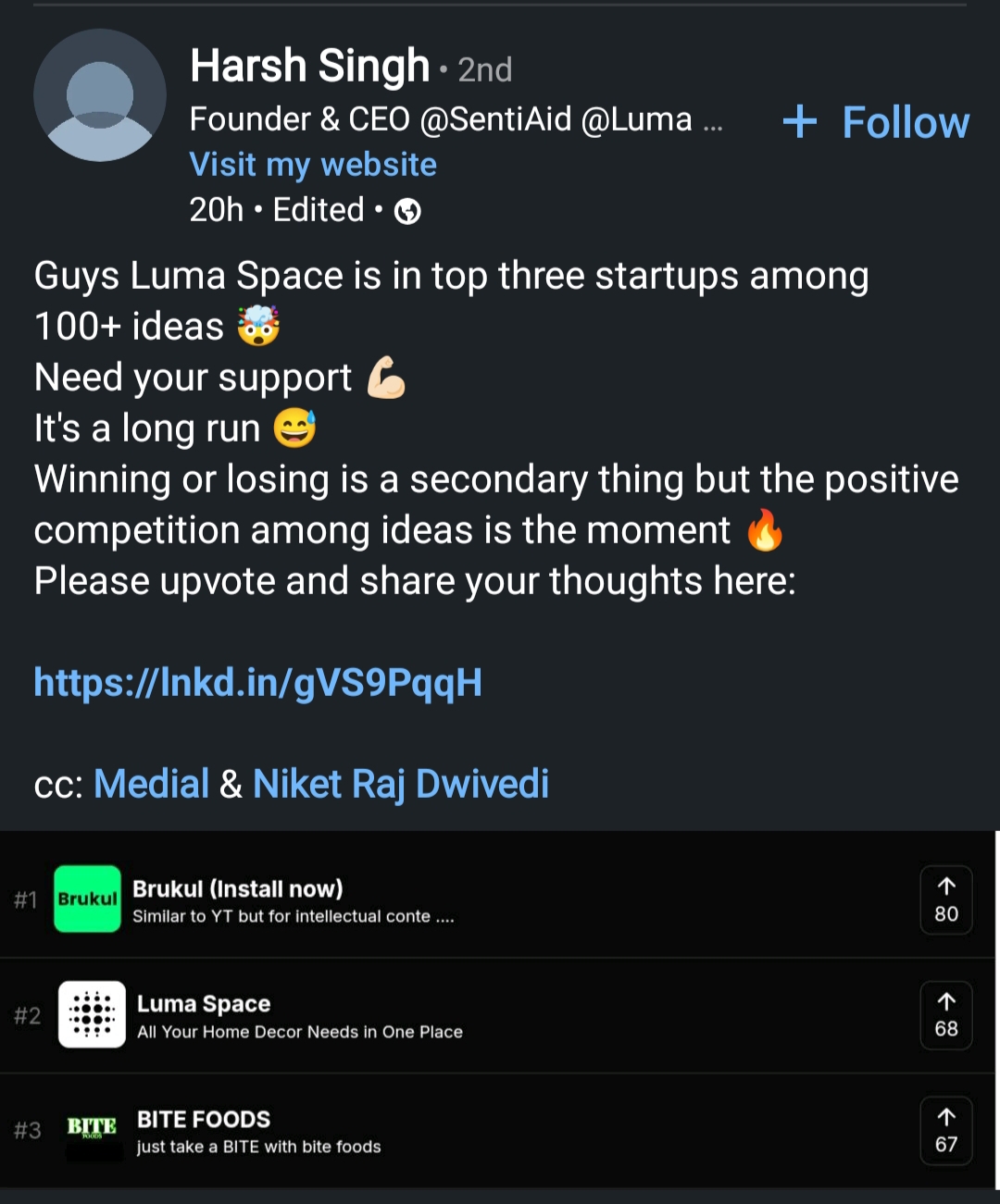 Over the last couple of days, I've been getting spammed with a lot of dms asking me to upvote for start up showcase ideas. While I appreciate the enthusiasm, I have a word of advice for participants. The medial community is small. It will get satura