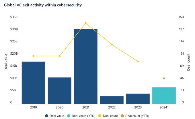 Google's $23 B offer for Wiz may reignite interest in deals and exits for cybersecurity start-ups. Wiz's $23 B offer from Google is ~2x the valuation of their Series E and 46x their ARR. Series E in May 24 : $1 B raised at $12 B valuation โฉInvest