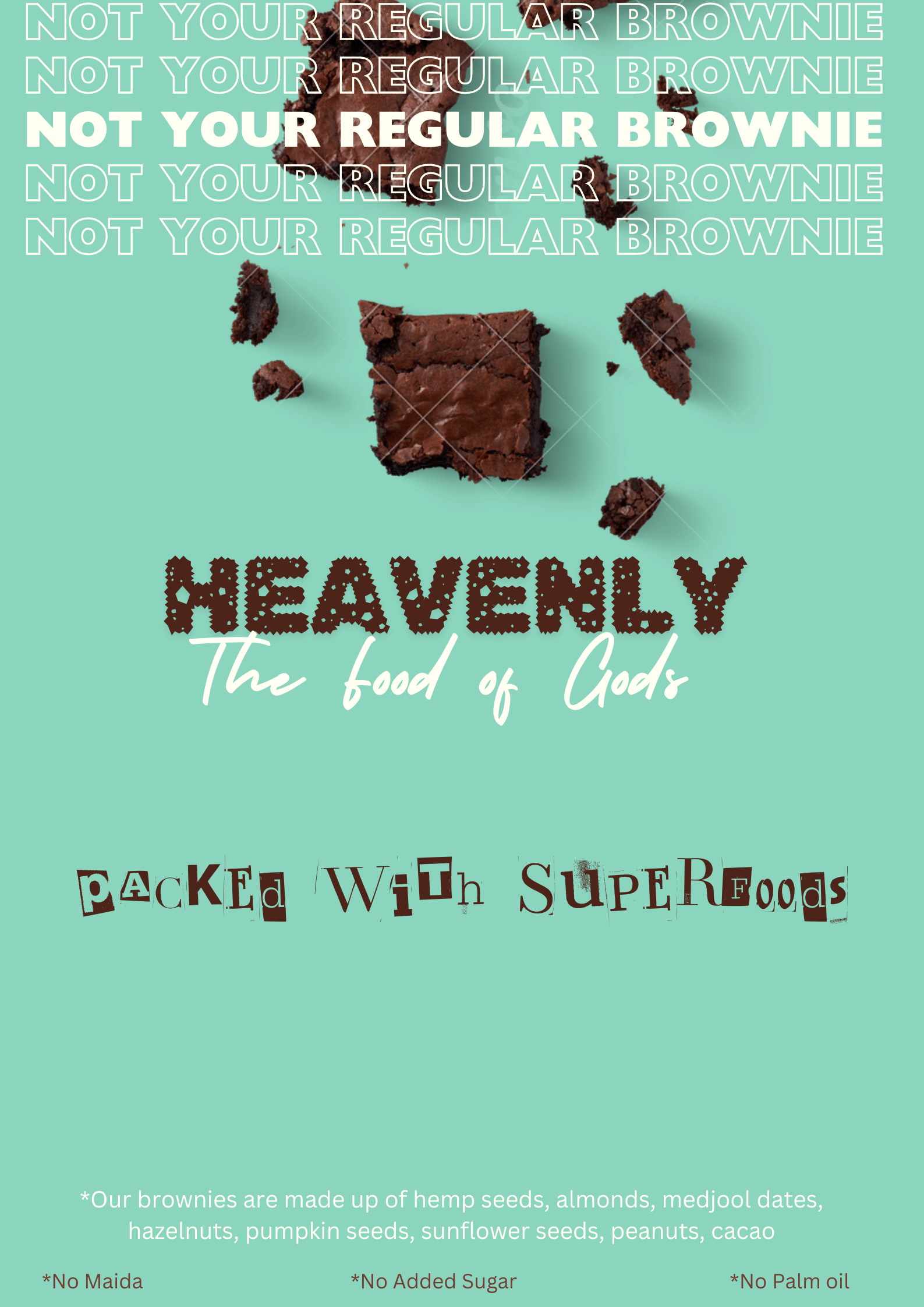 Not Your Regular! Here You have a Brownie that excites your tastebuds and overall Health. Made with superfoods _Hemp seeds, pumpkin seeds, sunflower seeds, peanuts, almonds. No sugar. No Maida. Packed with essential micro nutrients that boosts your mood. #Have_the_food_of_gods