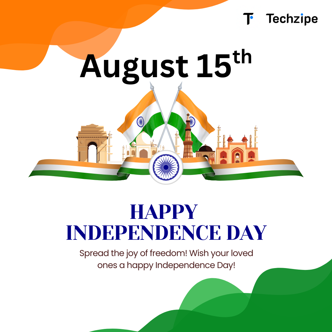 🇮🇳 Happy Independence Day from all of us at Techzipe! Today, we celebrate the unwavering spirit of freedom, courage, and unity that defines our nation. At Techzipe, we are inspired by this spirit to keep innovating, pushing boundaries, and creatin