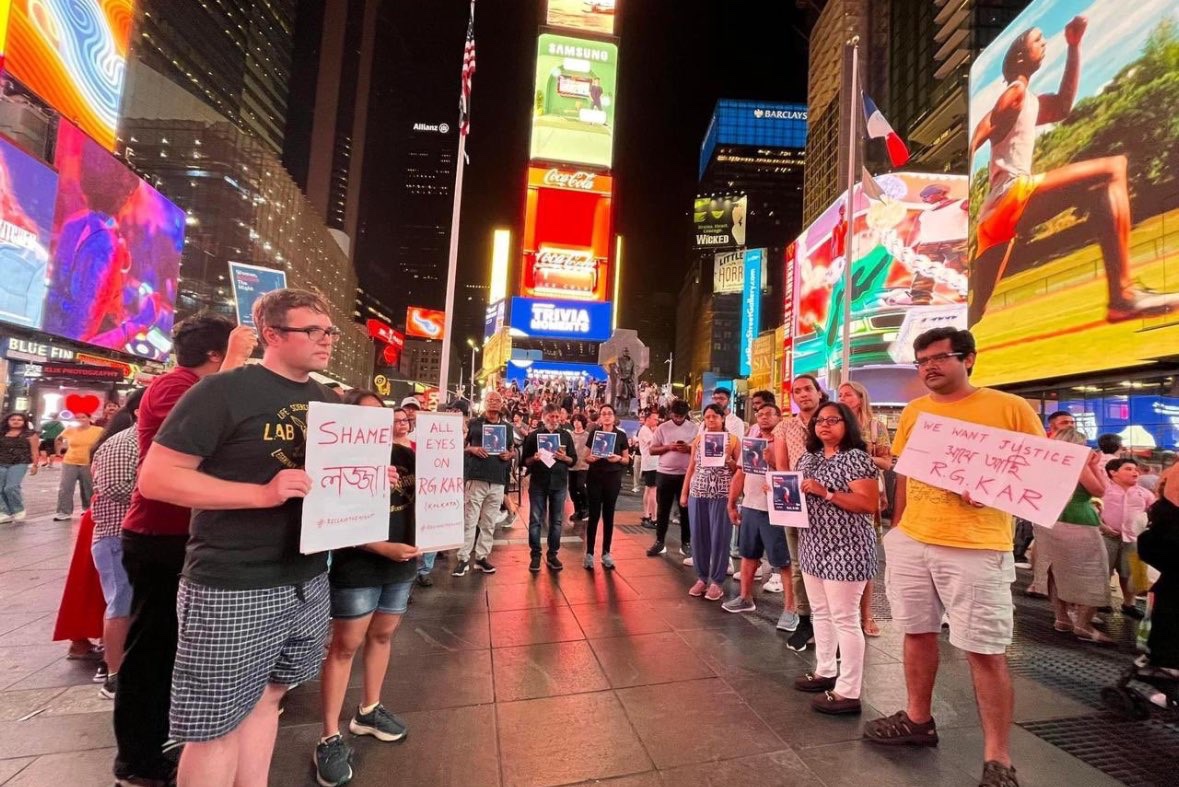The world is watching RG KAR Medical College! This image captures a protest in Times Square, USA, where people are rallying against the shocking crime committed against a female doctor.