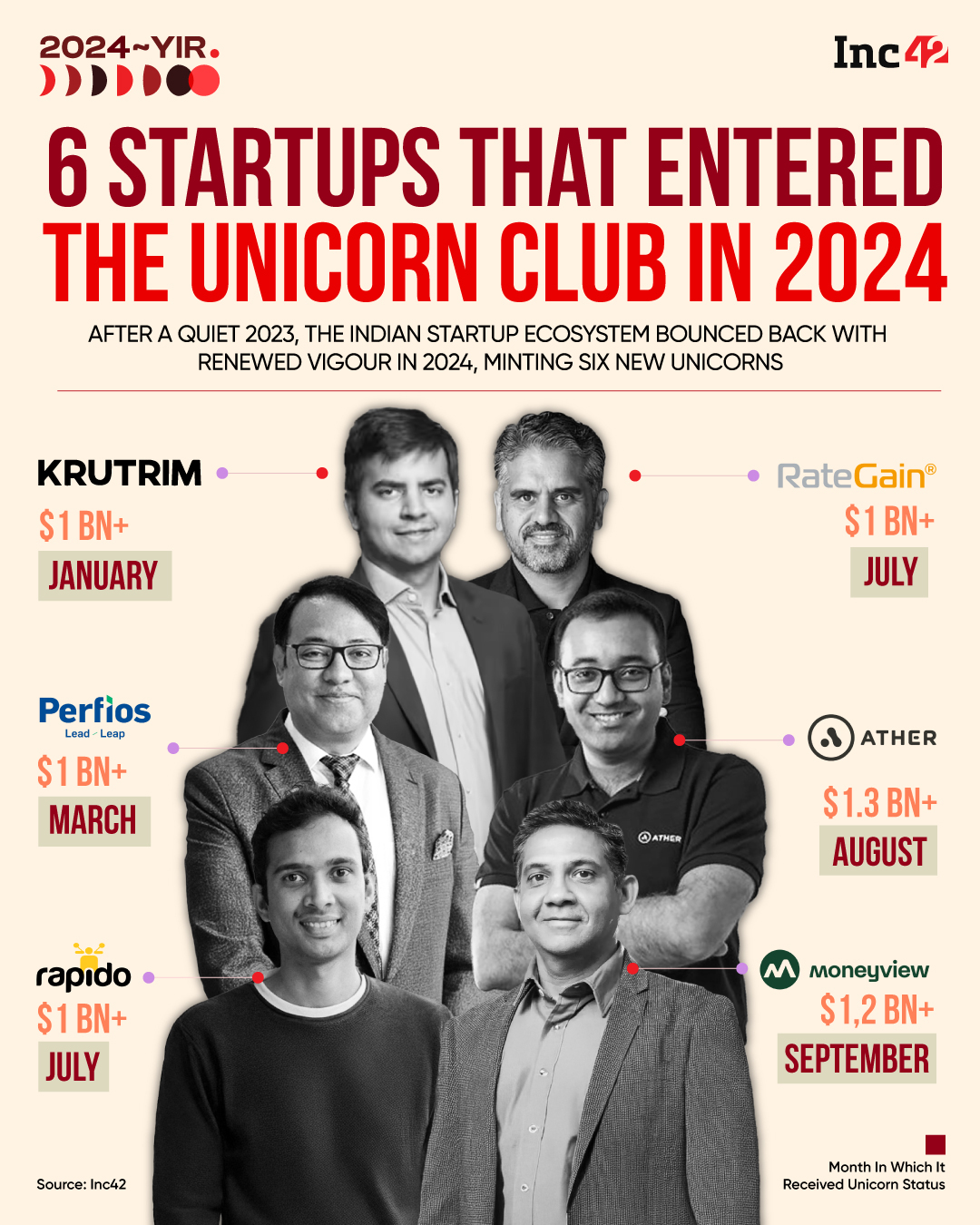 In 2024, six Indian startups achieved unicorn status, crossing the $1 billion valuation mark: 1. **Krutrim** - India's first AI unicorn, founded in 2023, secured $50 million in January. 2. **Ather Energy** - An electric two-wheeler manufacturer, bec