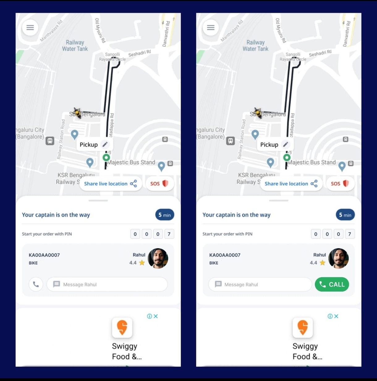 The first thing I do after booking a bike or cab is call the driver. However, it can be difficult for users to find the call option immediately, especially when they're in a hurry. So, I redesigned the UI to make it easier for users to access the cal