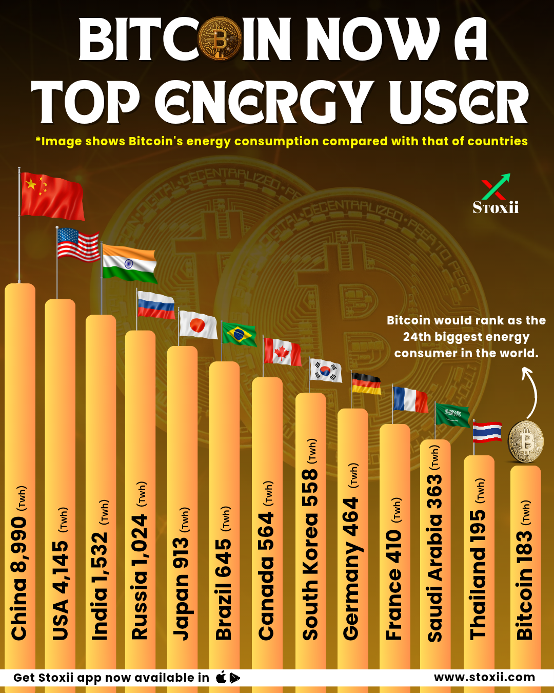 Bitcoin has officially entered the global energy charts. โก With an estimated annual consumption of 183 TWh, Bitcoin now uses more energy than countries like Thailand (195 TWh) and Saudi Arabia (363 TWh). If treated as a country, Bitcoin would rank as