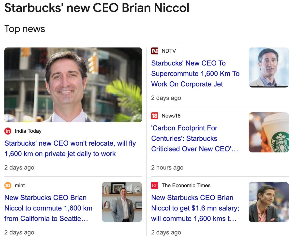 Starbucks has a new CEO Starbucks new CEO won't relocate Starbucks new CEO will fly 1600km on Corporate jet daily Bhai chal kya raha hain ?