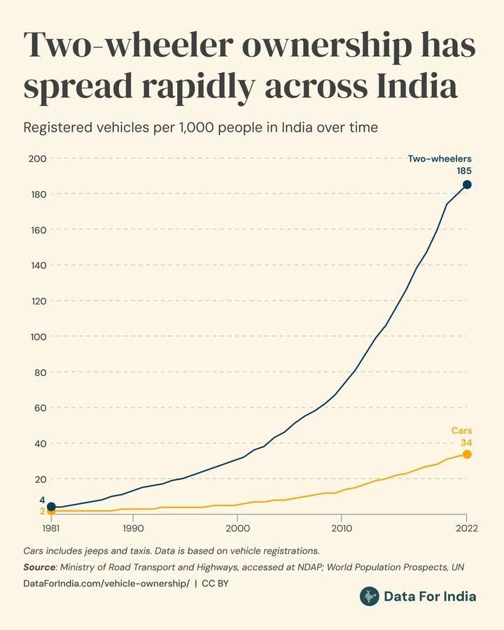Globally India has one of the lowest number of registered cars, but highest number of 2-Wheeler per 1,000 people.. As of 2022, India roads have more than 260 Million 2-Wheeler and more than 50 Million cars. Relative to the India’s population, there