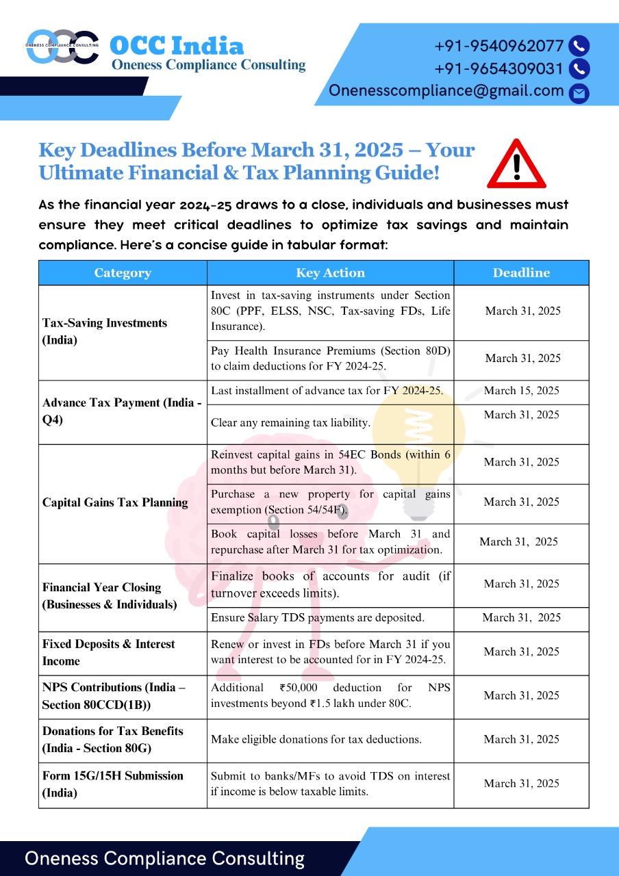 Summary of action points Before March 31, 2025 ✔ Review tax-saving investments. ✔ Pay pending taxes/advance tax. ✔ Submit investment proofs to employer (if salaried). ✔ Plan capital gains/losses for tax efficiency. ✔ Update financial records for the