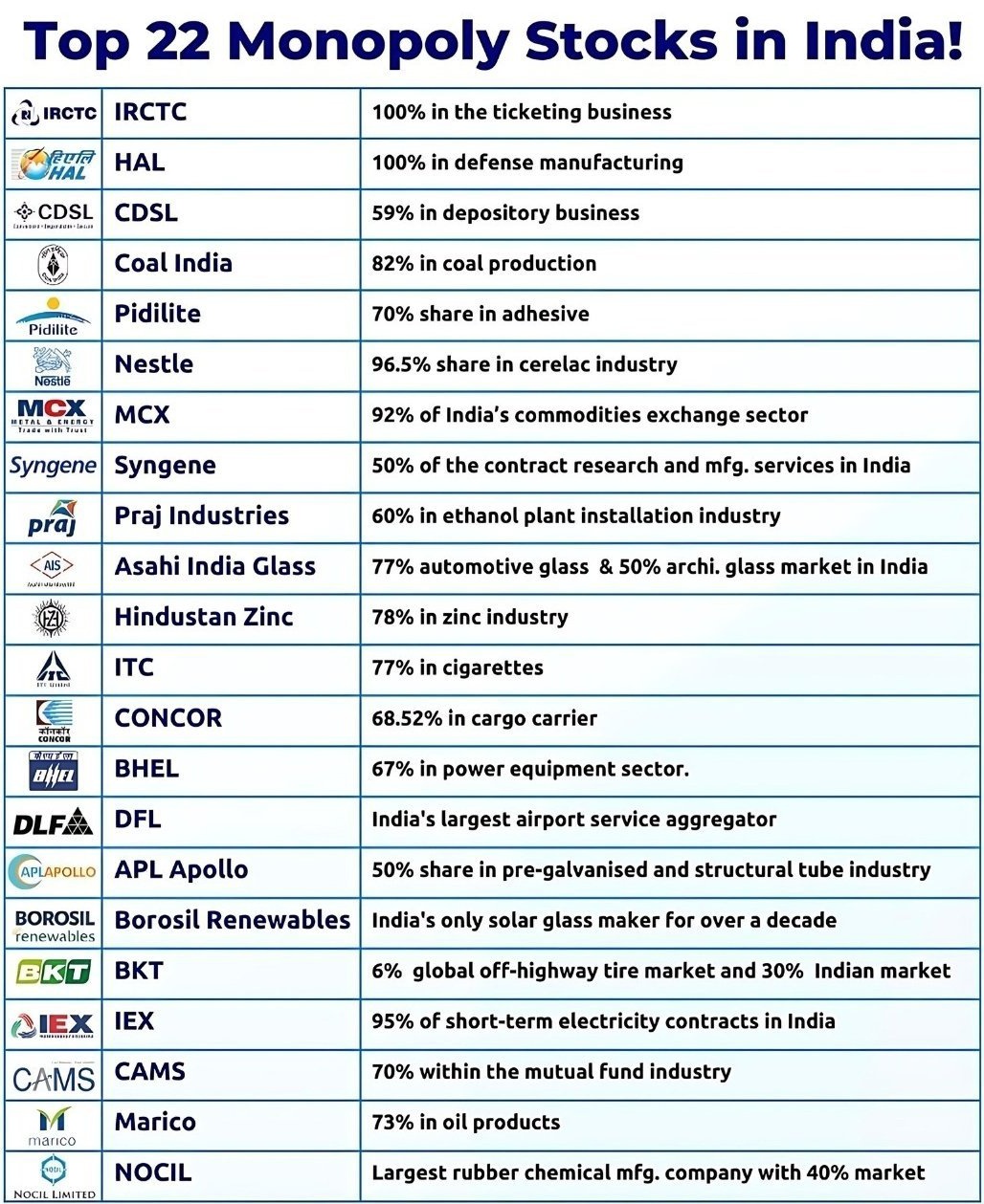 Top 22 Monopoly Stocks in India ๐ฎ๐ณ Want to invest where competition is almost zero? These companies dominate their industries โ from IRCTCโs 100% ticketing monopoly to Coal Indiaโs 82% market share in coal! ๐ผ Monopoly = Power = Profit! ๐ W