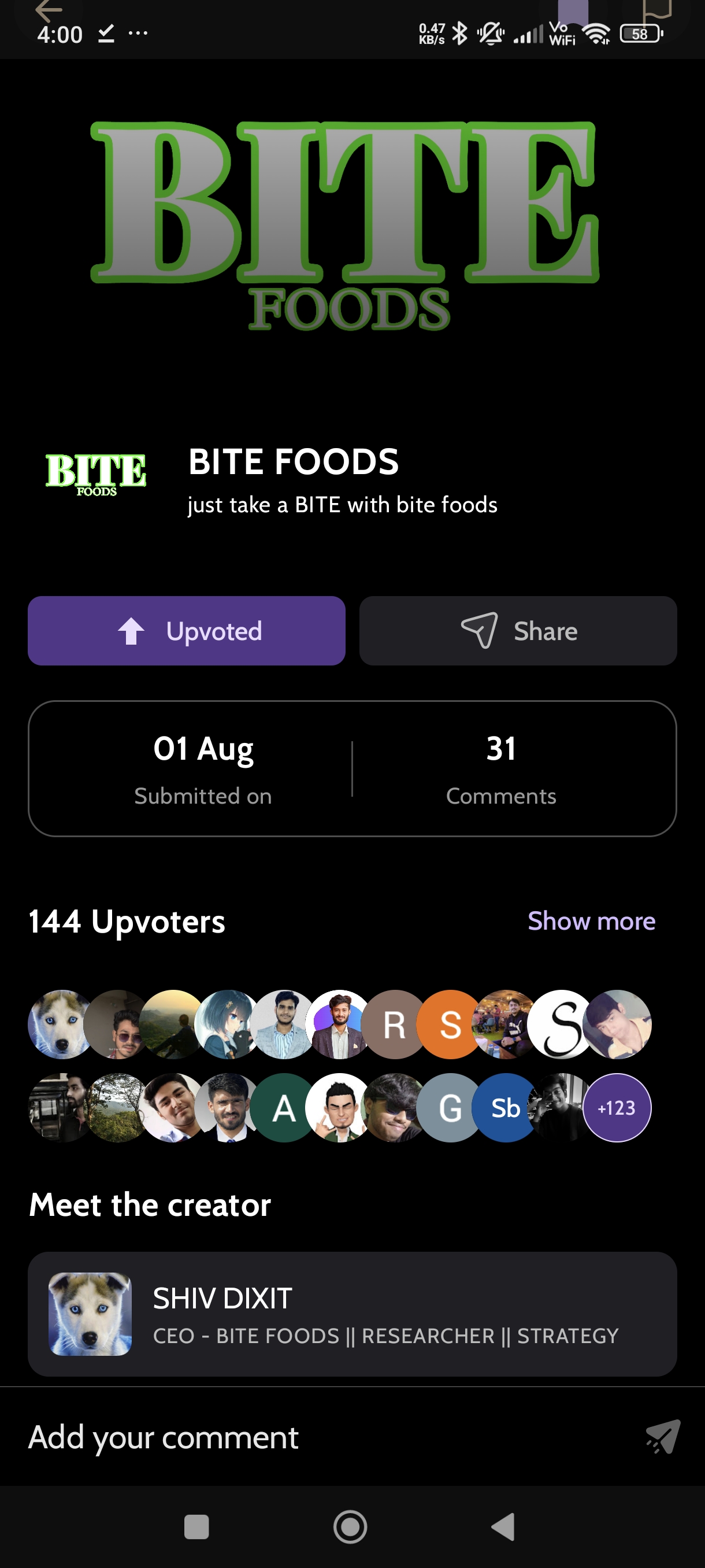 Hey , entrepreneurs can you please upvote my idea and give some suggestions, only if you think this has some potential. Need 10 Votes only 🙏 https://medial.app/idea/bite-foods-b149b8c1d971f