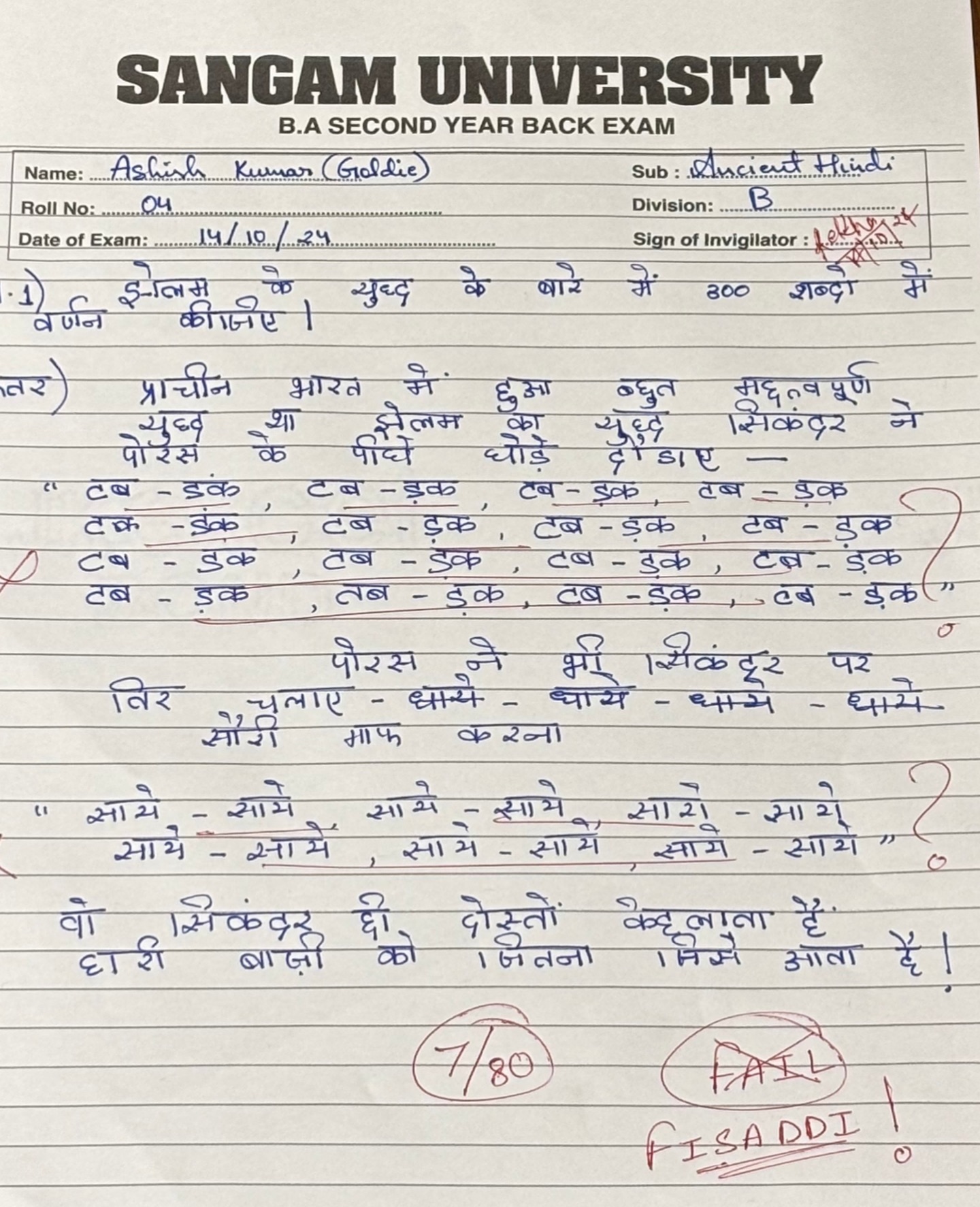 When the Creativity is Next Level, But the Marks Aren’t 🔥 A student got creative with their exam answer about war and battles... but unfortunately, creativity didn’t impress the teacher this time! Scored 7/80 and labeled "FISADDI" 😂. Ever had mo
