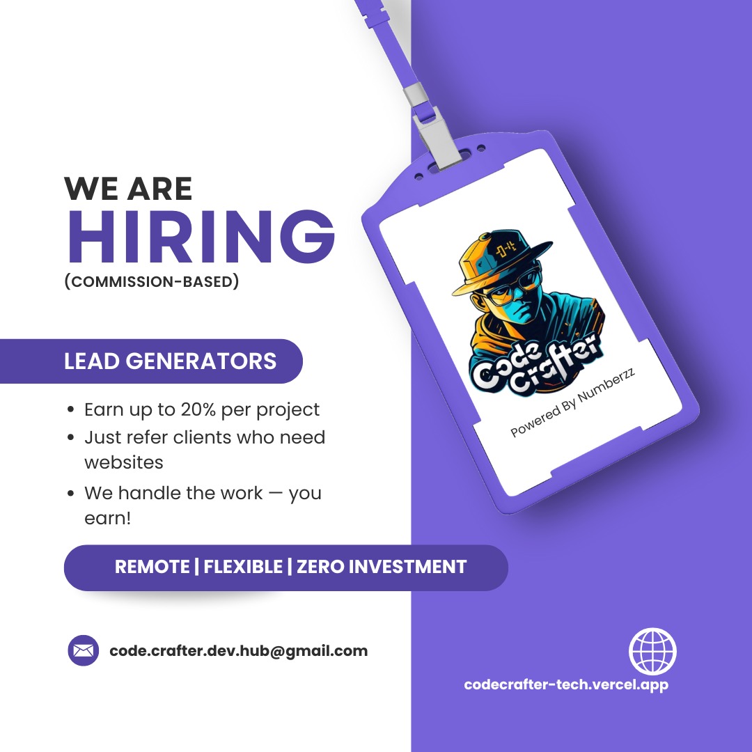 🚨 CodeCrafter is hiring commission-based lead generators! 💻 Refer people who need a website 💰 Earn up to 20% commission per successful deal 📍 Work from anywhere ✅ No tech skills required Whether you’re a student, freelancer, marketer, or just s