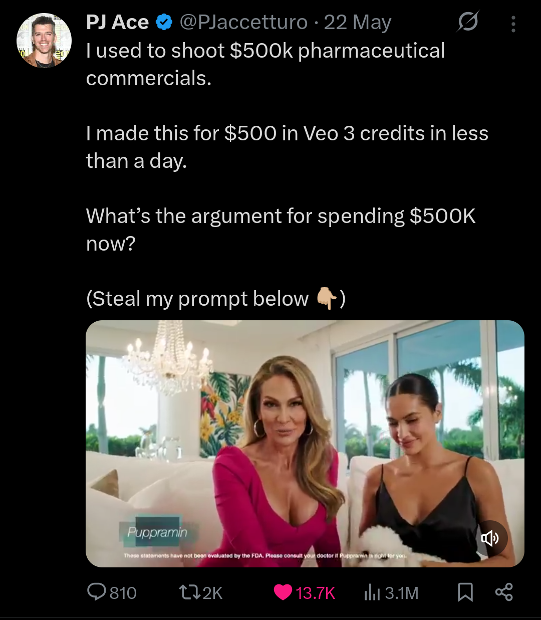 Check this out! By PJ Ace on X A Masterpiece of ads using Googleโs latest Veo 3 model by PJ Ace. A commercial pharmaceutical ad. Proof that just mastering one skill (Creative Writing) with creativity can take you a long way. And AI isn't replac