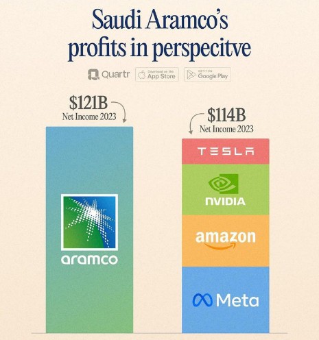 Saudi Aramco’s 2023 profits ($121B) outshine Tesla, Nvidia, Amazon, and Meta combined. Oil still reigns supreme in the global economy💰