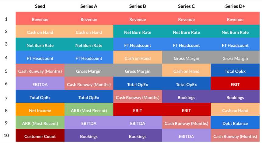 🚨 Critical Startup Metrics VCs look for ➨ When securing venture capital, 4 key metrics are essential at EVERY stage of a startup's growth: • Revenue • Net Burn Rate • Full-time Employee Headcount • Gross Margin ➨ Cash is king in early stages but starts to become less critical in later stages ➨ Also, as startups grow, VCs start looking more at OPERATIONAL EFFICIENCIES instead of just survival metrics like cash runway Refer the image below. This will give you a good understanding of which metrics matter at each stage and align with what investors really want.