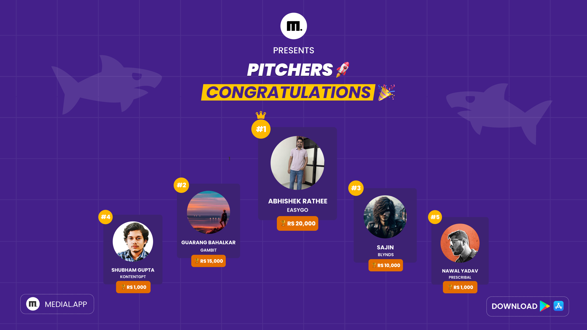 Medial Pitchers (April 2024) Winners announcement : - After days of discussion and a final ranking by our esteemed VCs, the results are finally out. I’d like to thank the participants, our team and our judges Sarthak Singh from Accel and Anand Luni
