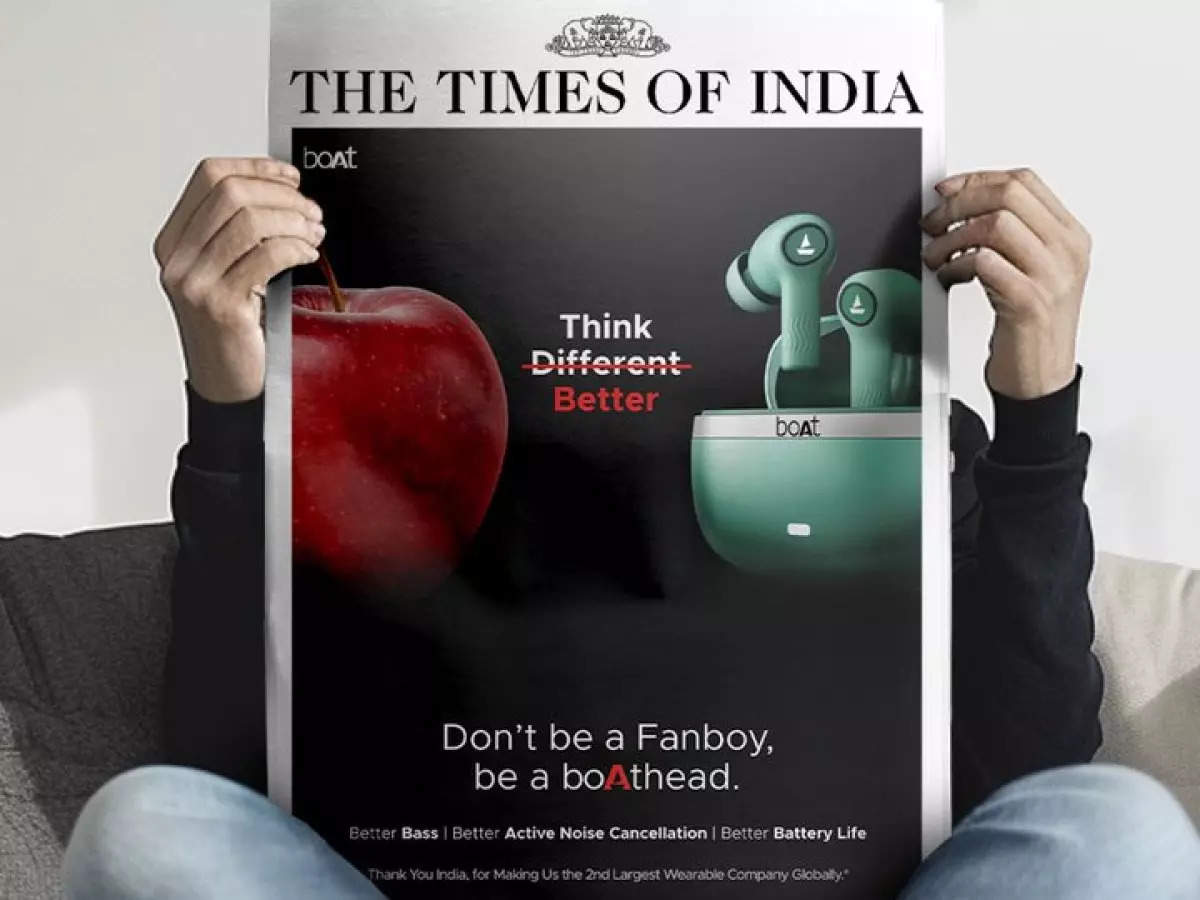 How did boat's brand image go improve because of apple ? Apple has a tagline called " think different" and boat started a marketing campaign on newspaper trolling Apple's tagline. This caused fan wars in social media and everyone was talking about this. While boat tackles lower and mid range products and apple tackles premium segment, they weren't competitors. But since it was compared to a premium brand " Apple " it got it's brand image improved and also got new customers as there was a lot of conversation and debate on this topic. This is how edgy marketing helps you to stand out.