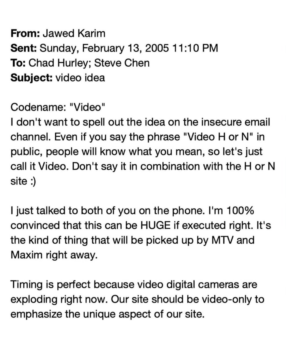 The Email That Changed the Internet: How a Simple Vision Became YouTube. โถ๏ธ Jawed Karim's Visionary Email on a Video-Only Platform In 2005, YouTube co-founder Jawed Karim sent an email proposing a platform dedicated solely to video content. His id