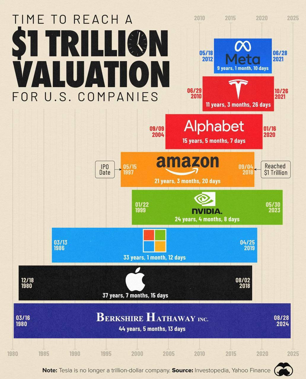 🗣How long did it take global companies to reach a $1 trillion market capitalization? Berkshire Hathaway made history by becoming the eighth American company to achieve a $1 trillion market valuation. 💰📈