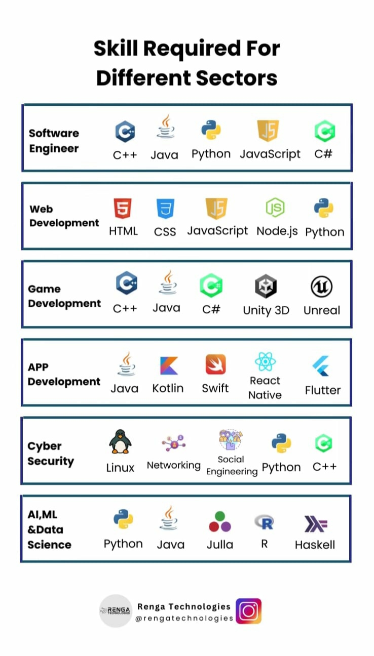 Hey folks I hope you are doing great I just found this amazing skill chart from renga technologies from Instagram, In case any of you want to switch fields or learn a new skill. Here's where to start 👇