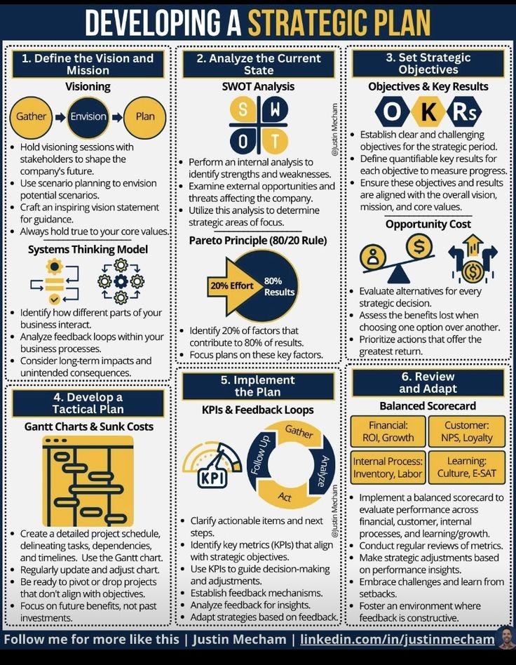 How to develop a strategic plan ? 1. Define value and mission 2. Analyze Current State 3. Set strategic objectives 4. Develop a tactical plane 5. Implement and have f-loop 6. Review and adapt